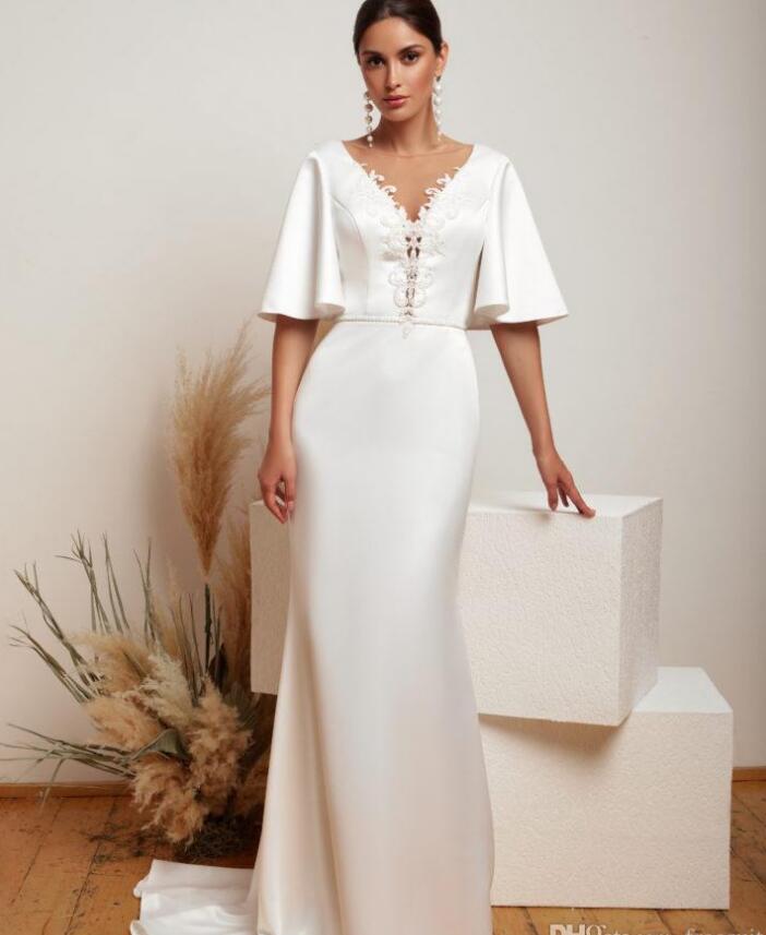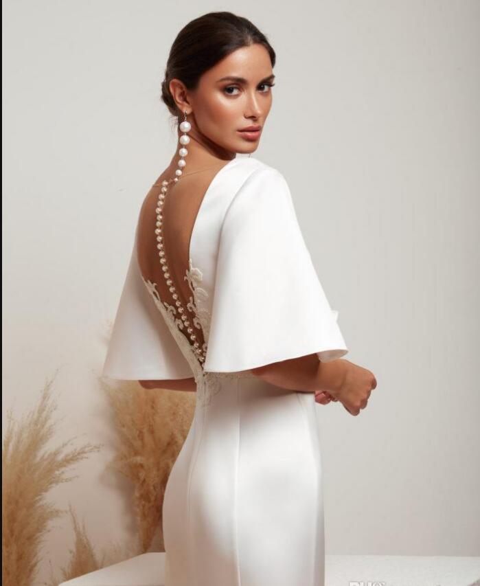 Bohemian Mermaid Wedding Dresses Sheer Scoop Neck Appliqued Half Sleeves Bridal Gowns Ruffled Sweep Train Ruched Satin Vestidos De Novia