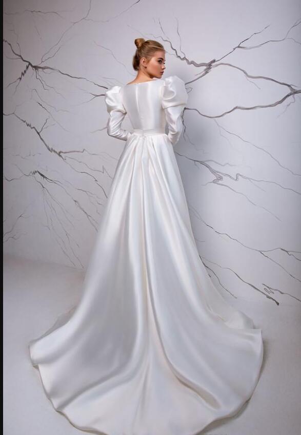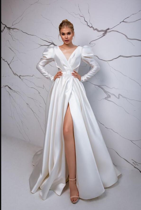 Elegant Vintage Wedding Dresses V-neck High-split Long Sleeve Sweep Train Satin Wedding Dress Ruffle Custom Made Robes De Mariée