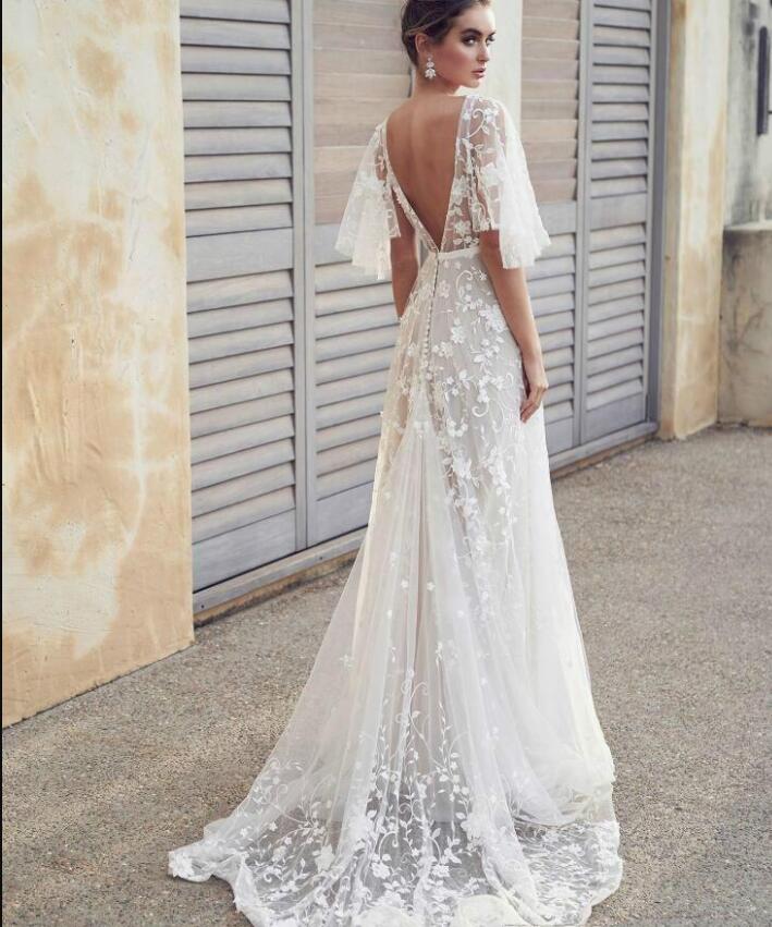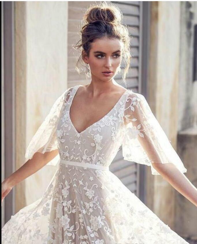 Bohemian Wedding Dresses V Neck Lace Appliqued Backless Sweep Train Half Sleeves Bridal Gowns Custom Made