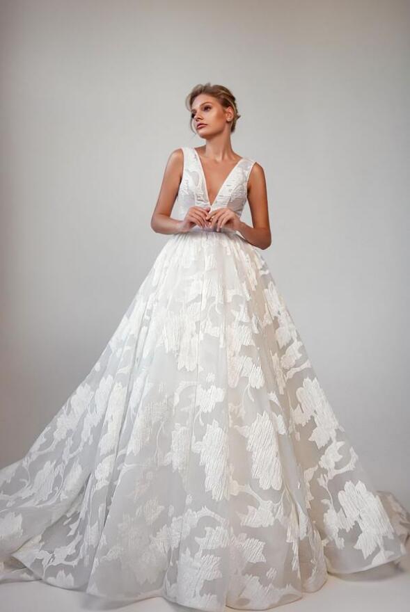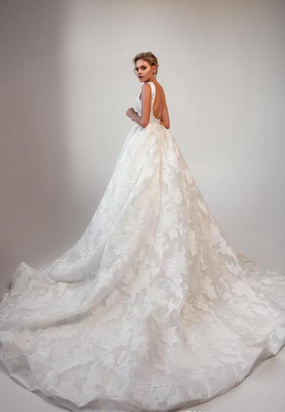 V-neck Backless Wedding Dresses Elegant Sleeveless Printed Wedding Gown A-line Custom Made Court Train Ruched Bridal Dress