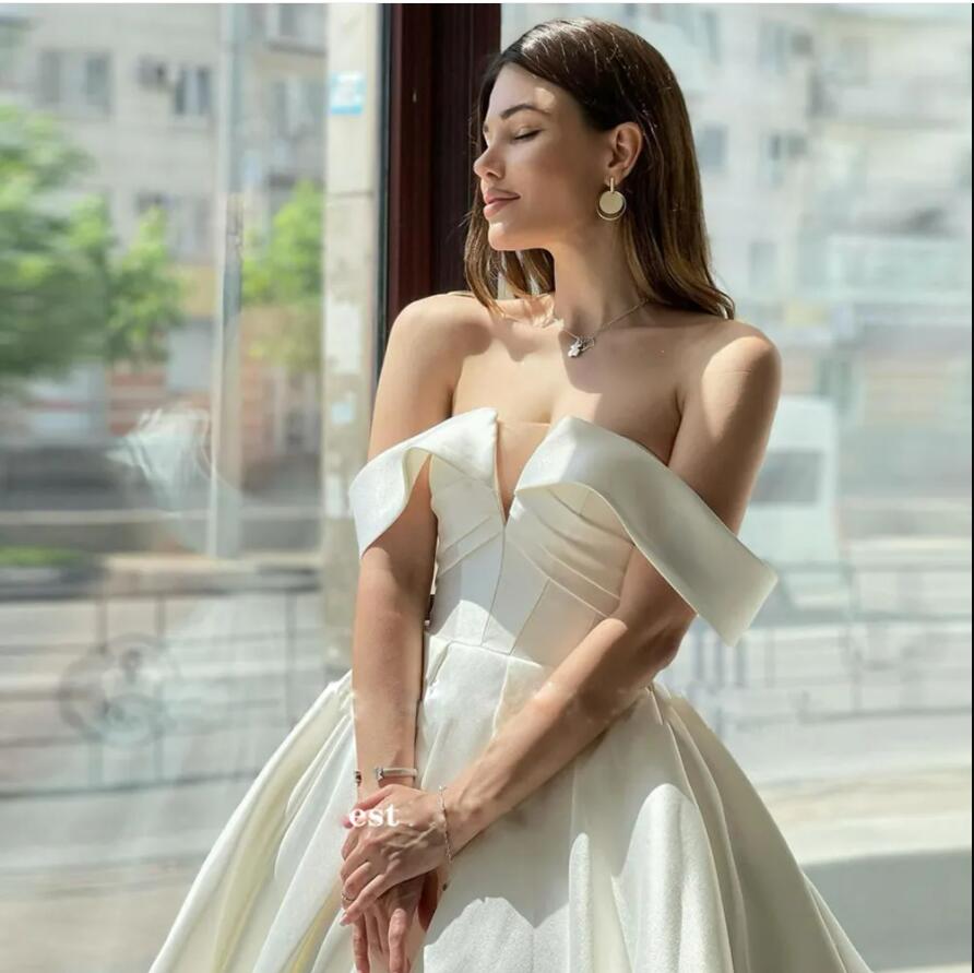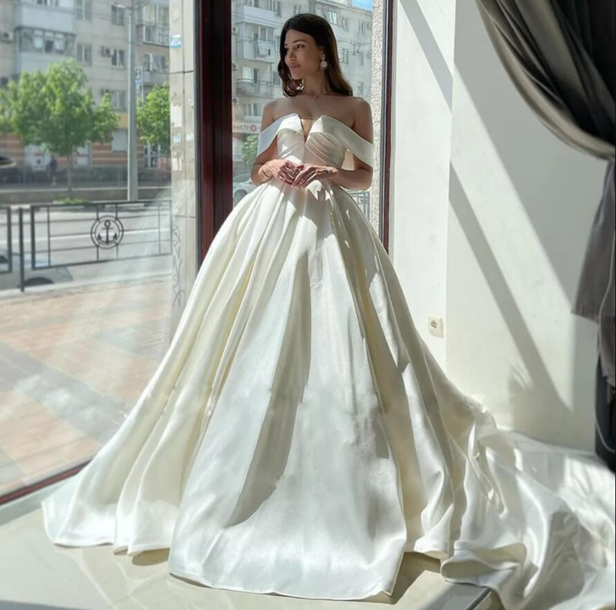 Satin A Line Wedding Dresses Off the Shoulder Ruched Princess Bridal Gown Simple Garden Dress for Bridal