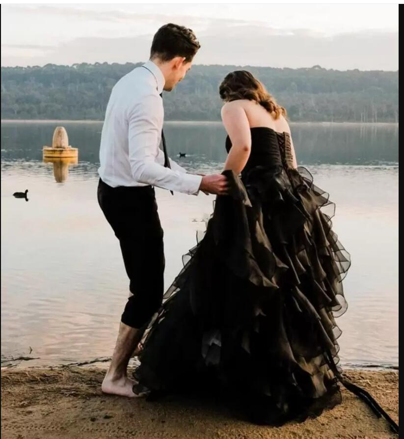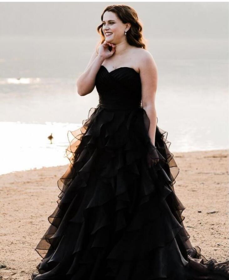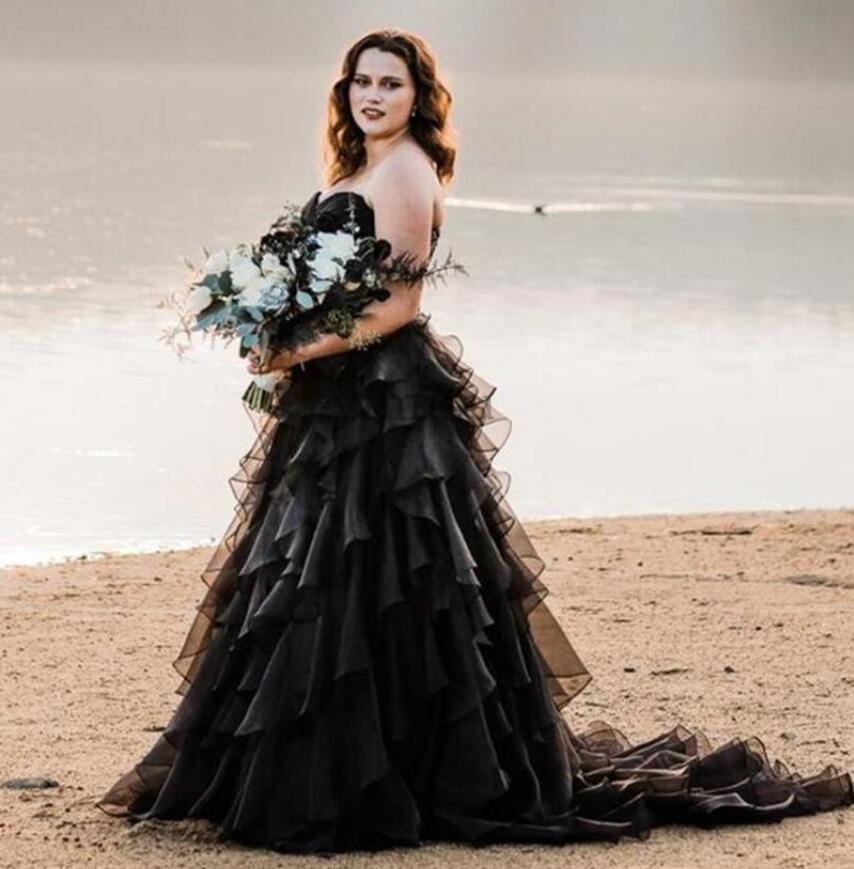 Gothic Black Wedding Dresses A Line Sweetheart Summer Beach Boho Organza Tiered Ruffles Floor Length Formal Plus Size Bridal Gowns