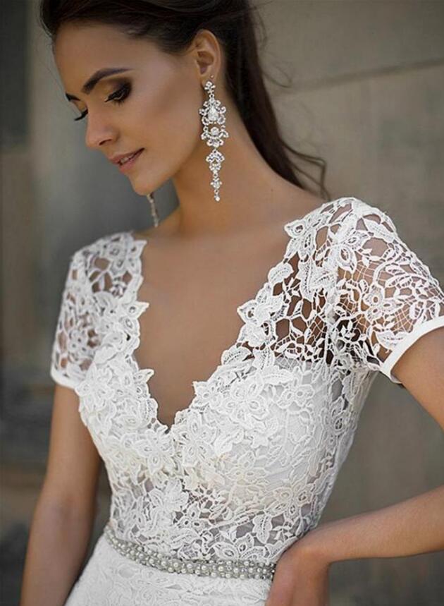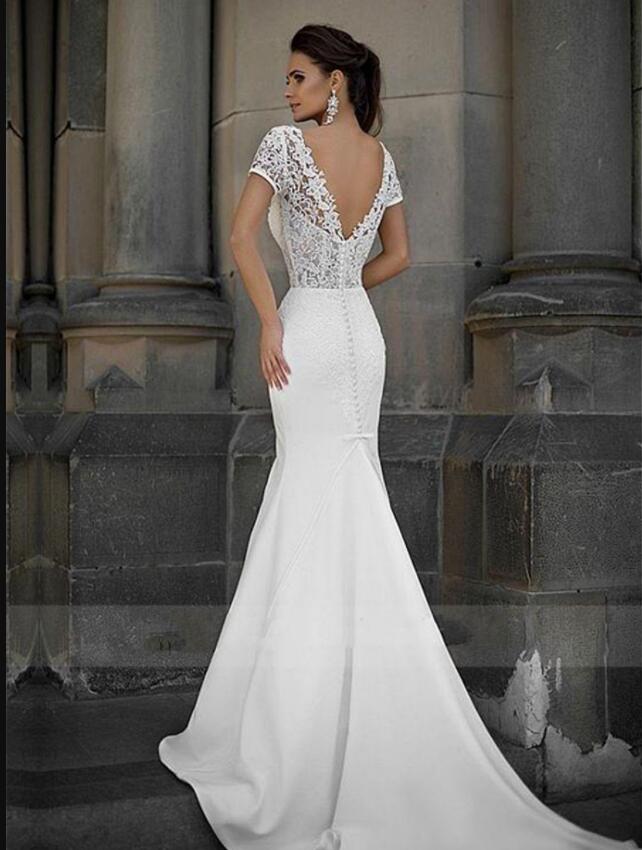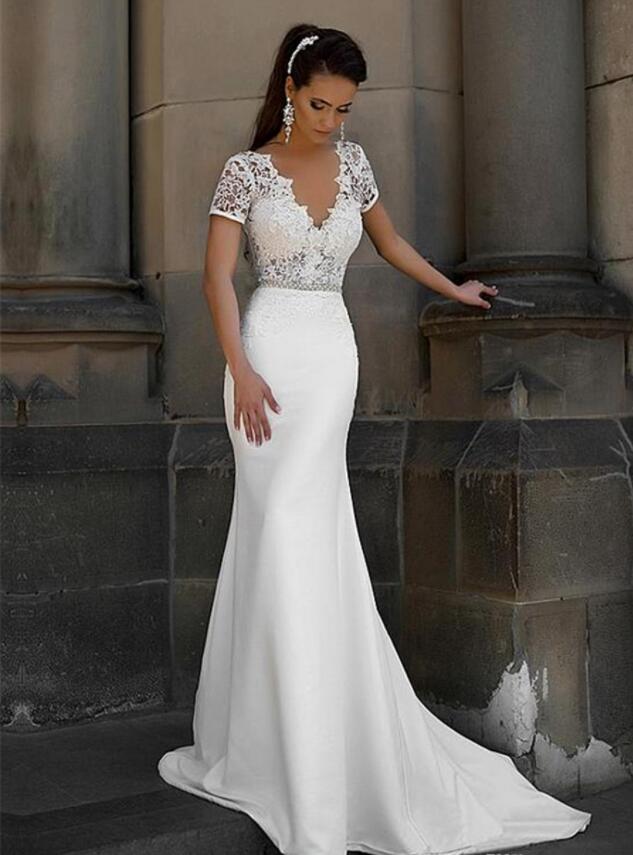 New Design White Lace Satin V Neck Mermaid Wedding Dresses With Pearls Short Sleeves Bridal Dresses