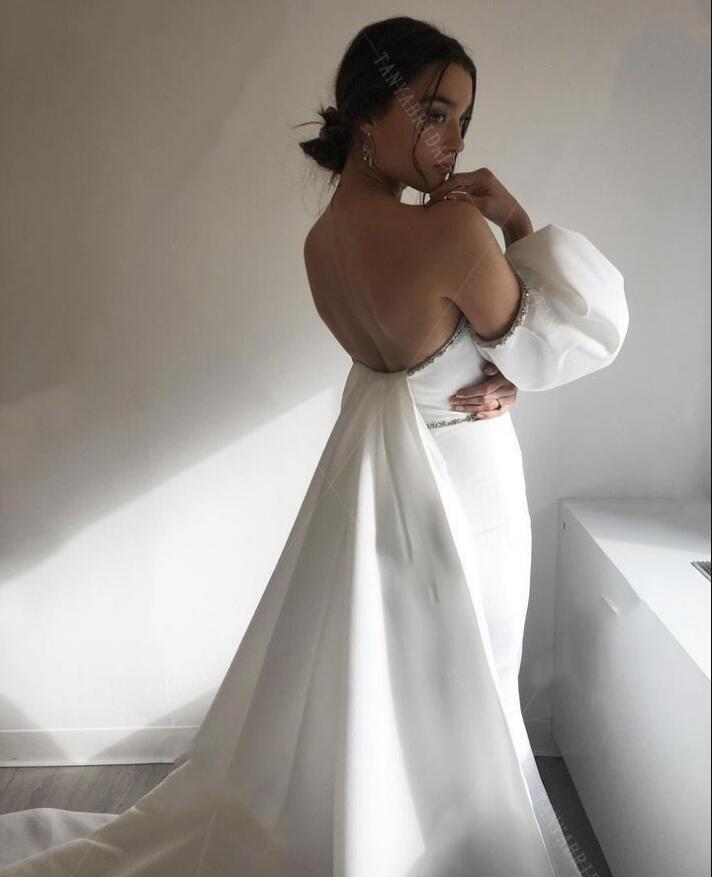 Gorgeous Simple Satin Plus Size Mermaid Wedding Dresses Strapless Short Sleeves Watteau Train Backless Beaded Bridal Dress Gowns