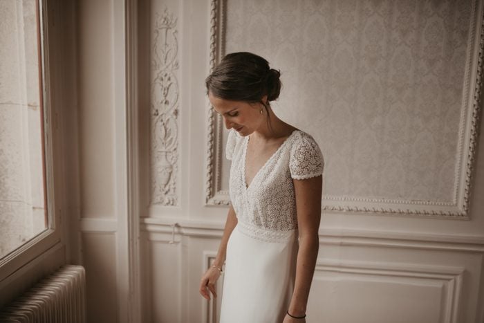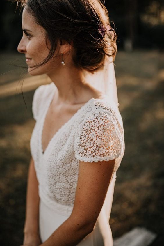 Clasic Wedding Dress, Cap Sleeves Wedding Gown, Lace Top Satin Bridal Dress