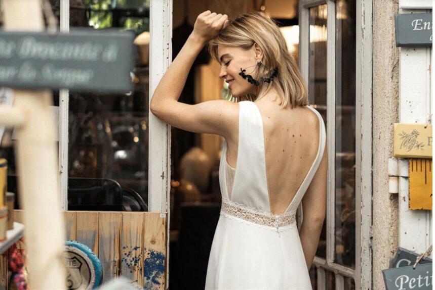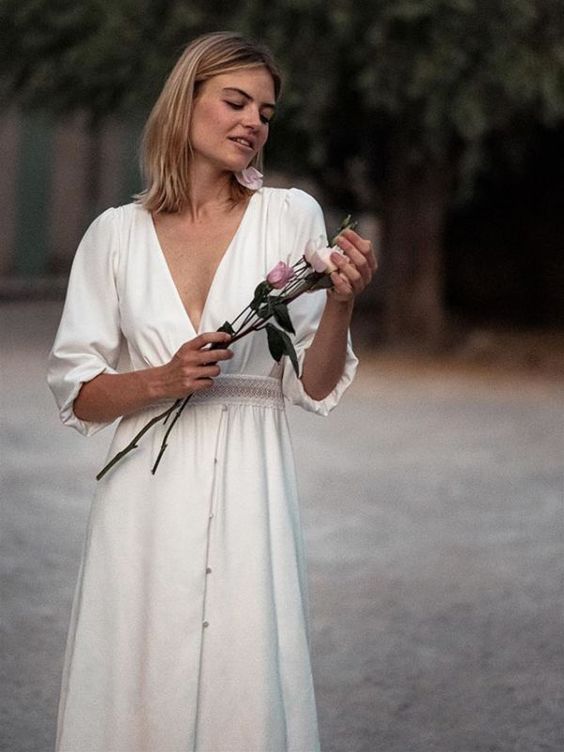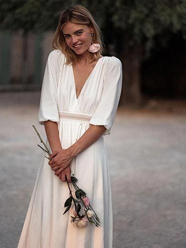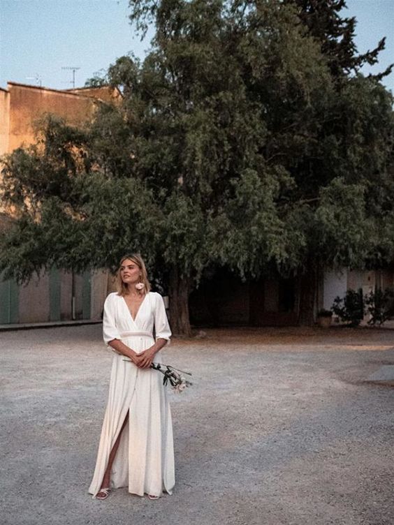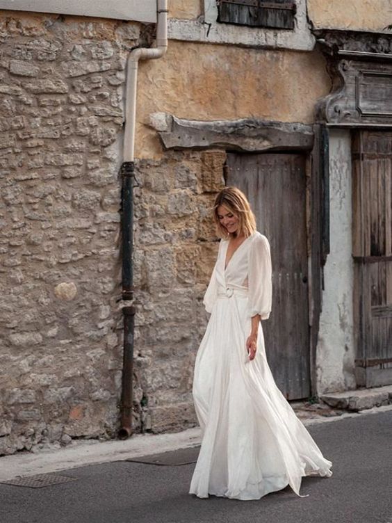 Boho Wedding Dress, Deep V-neck Wedding Gown, Long Sleeves Open Back Bridal Dress