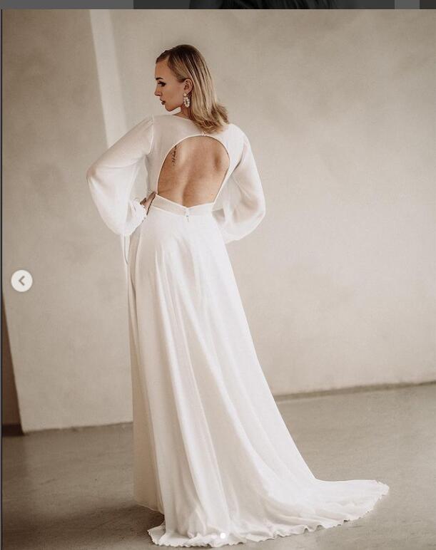 Chiffon Wedding Dress, Simple Beach Wedding Gown, Long Sleeve Bridal Dress