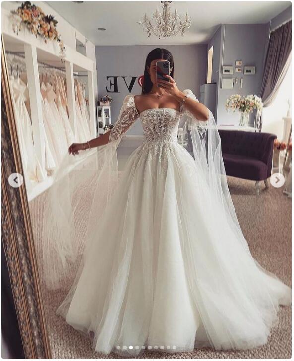 Stapless Wedding Dress, Lace Appliques Wedding Gown, Puffy Bridal Dress