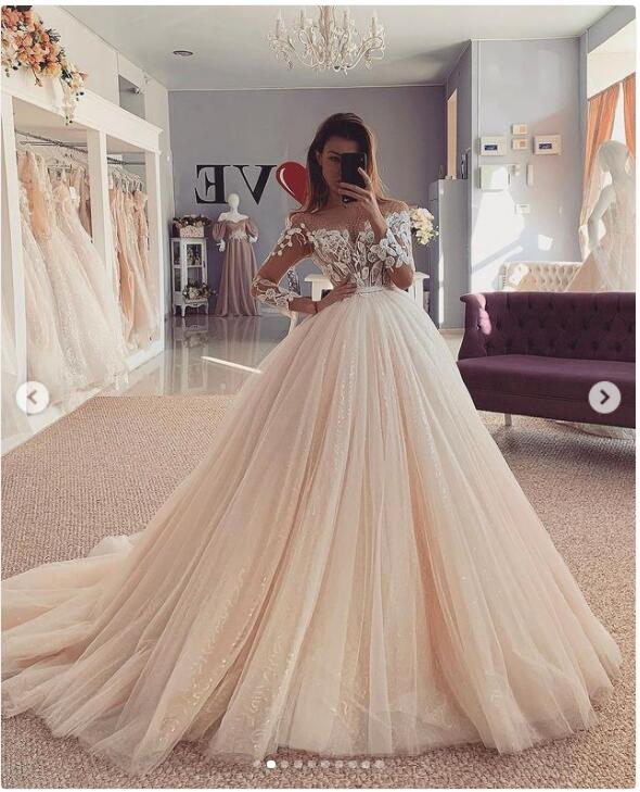 Long Sleeve Wedding Dress, Lace Appliques Wedding Gown, Puffy Bridal Dress