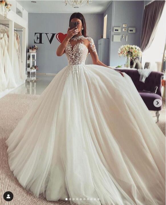High Neck Wedding Dress, Lace Appliques Wedding Gown, Puffy Bridal Dress