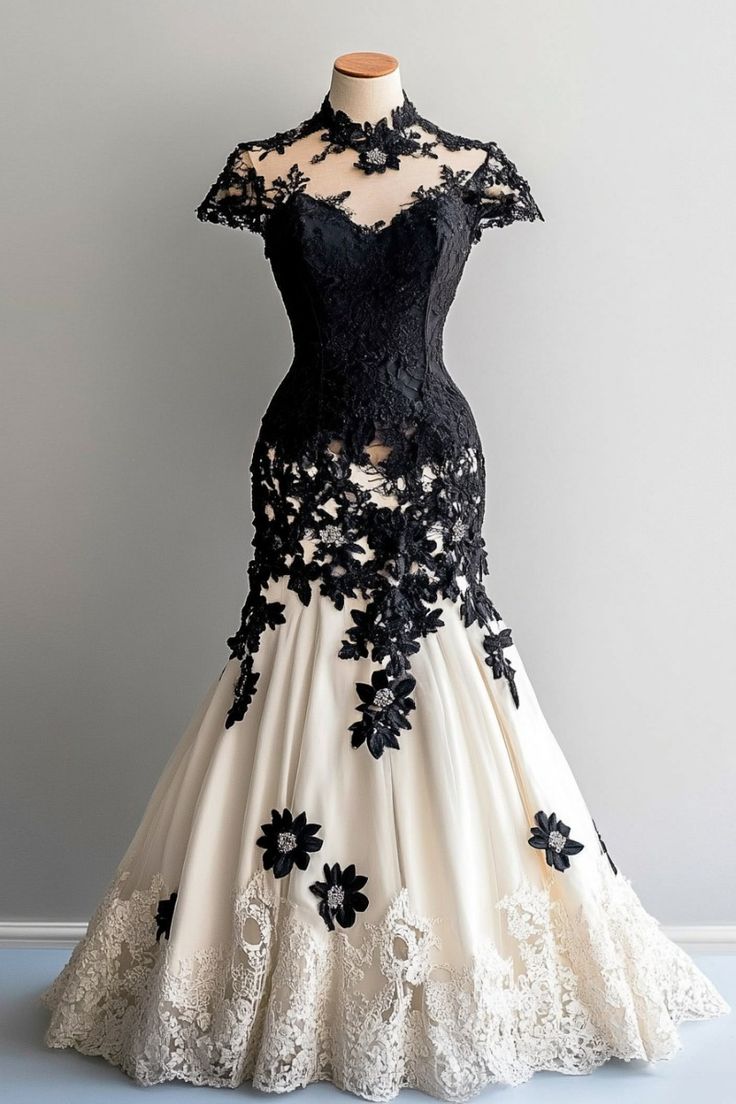Black and White Wedding Dress, Gothic Lace Appliques Bridal Dress Bridal Gown