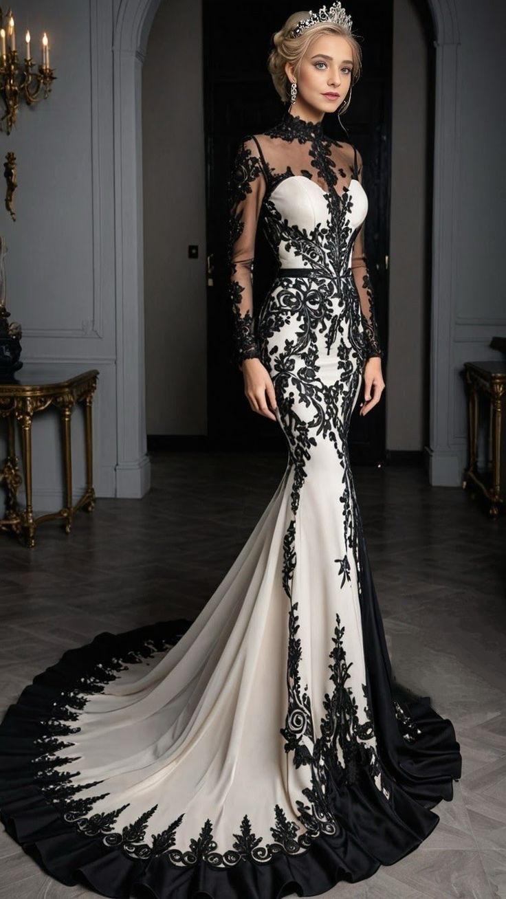 Black and White Wedding Dress, Gothic Lace Appliques Bridal Dress Bridal Gown
