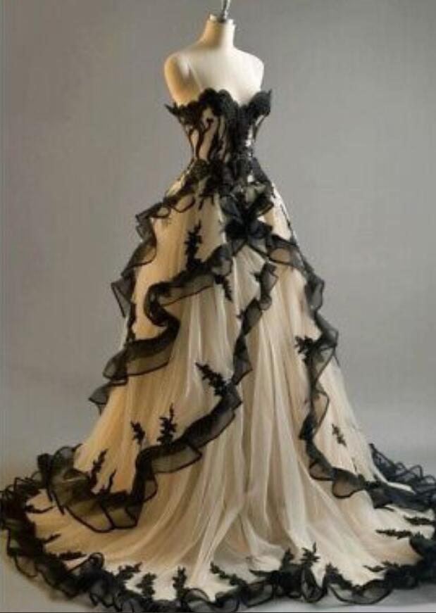 Gothic Wedding Dress, Ball Gown Lace Appliques Bridal Dress Bridal Gown