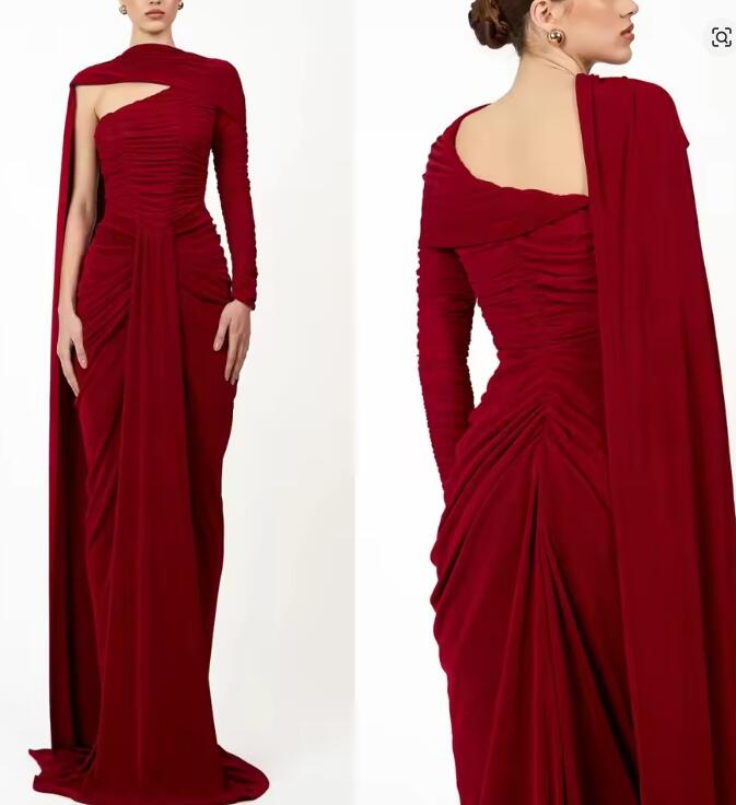 Customized Delicate One Shoulder Long Sleeves Evening Dress Graceful Ribbons Floor Length Party Dress Sexy Sheath