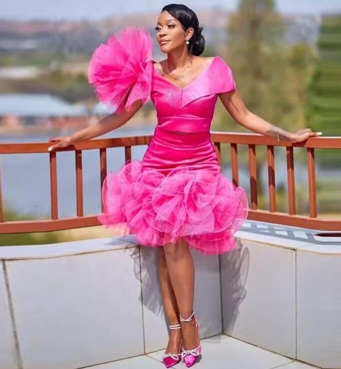 Romantic Fuchsia Sheath Women Mini Maxi Dress Ruffles Organza Aso Ebi Female Short Dresses To Birthday Party