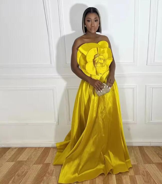 Pretty Gold Formal Satin Long Party Gowns With 3D Flower Details Bloom African Women Maxi Dress Floor Length Lace up Gala Dress