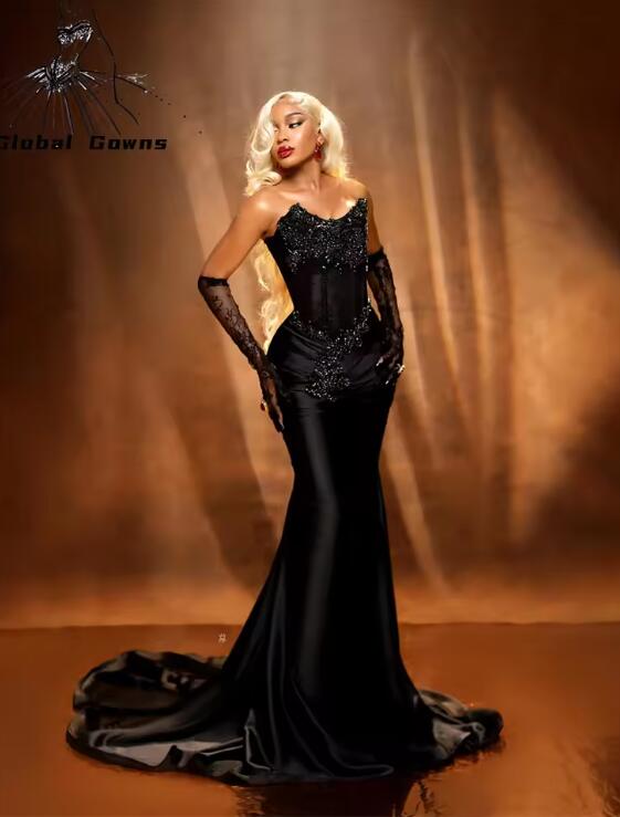Black Strapless Appliques Long Prom Dresses For Black Girls Beaded Crystal 2025 Birthday Luxury Dress With Glove Customized