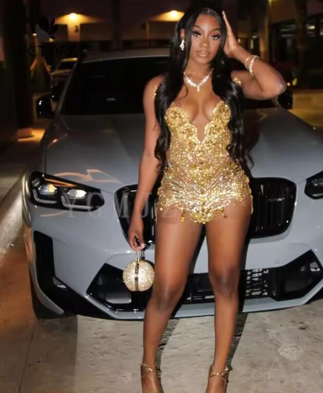 Gold Sparkly Rhinestone Short Prom Cocktail Dresses 2025 Luxury Beaded See Through Black Girls Birthday Party Gown Customized