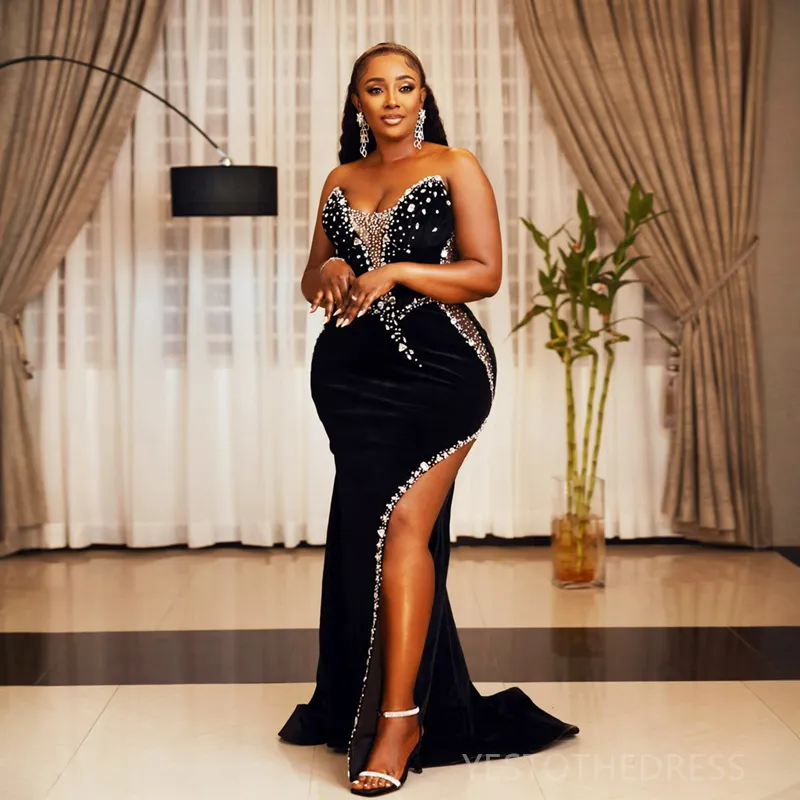 Plus Size Black Prom Dresses for Special Occasions Promdress Illusion Beaded Rhinestones Decorated Side Split Birthday Dress Second Reception Dress