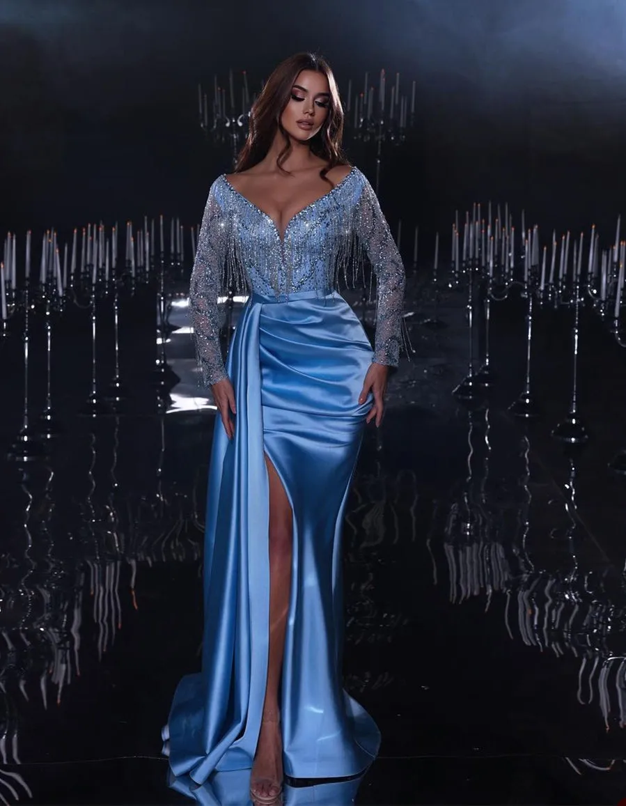 Satin Blue Beads Evening Dress V Neck Long Sleeve Crystal Beading Mermaid Prom Dresses Side Split Special Occasion Robe Gowns