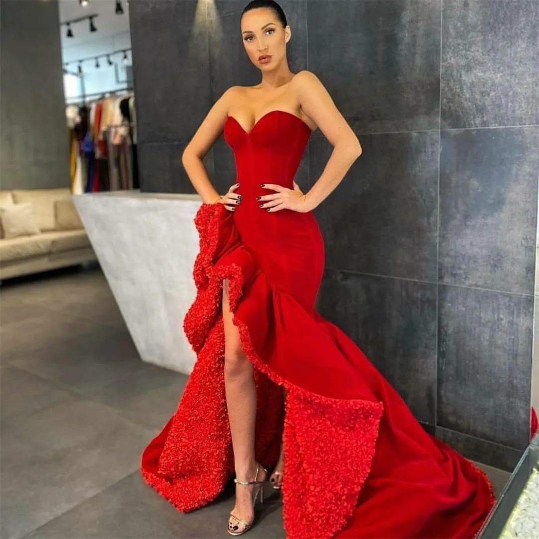 Red Mermaid Prom Dresses Ruffles Side Slit Sweetheart Formal Evening Gowns vestido de novia Special Occasion Dress