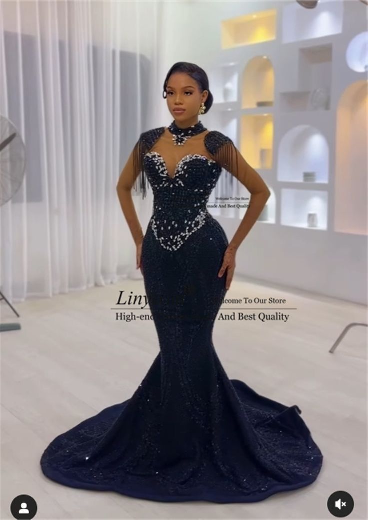 Black Mermaid Beading Crystal African Girls Prom Dress Evening Formal Gown Birthday Party Dress